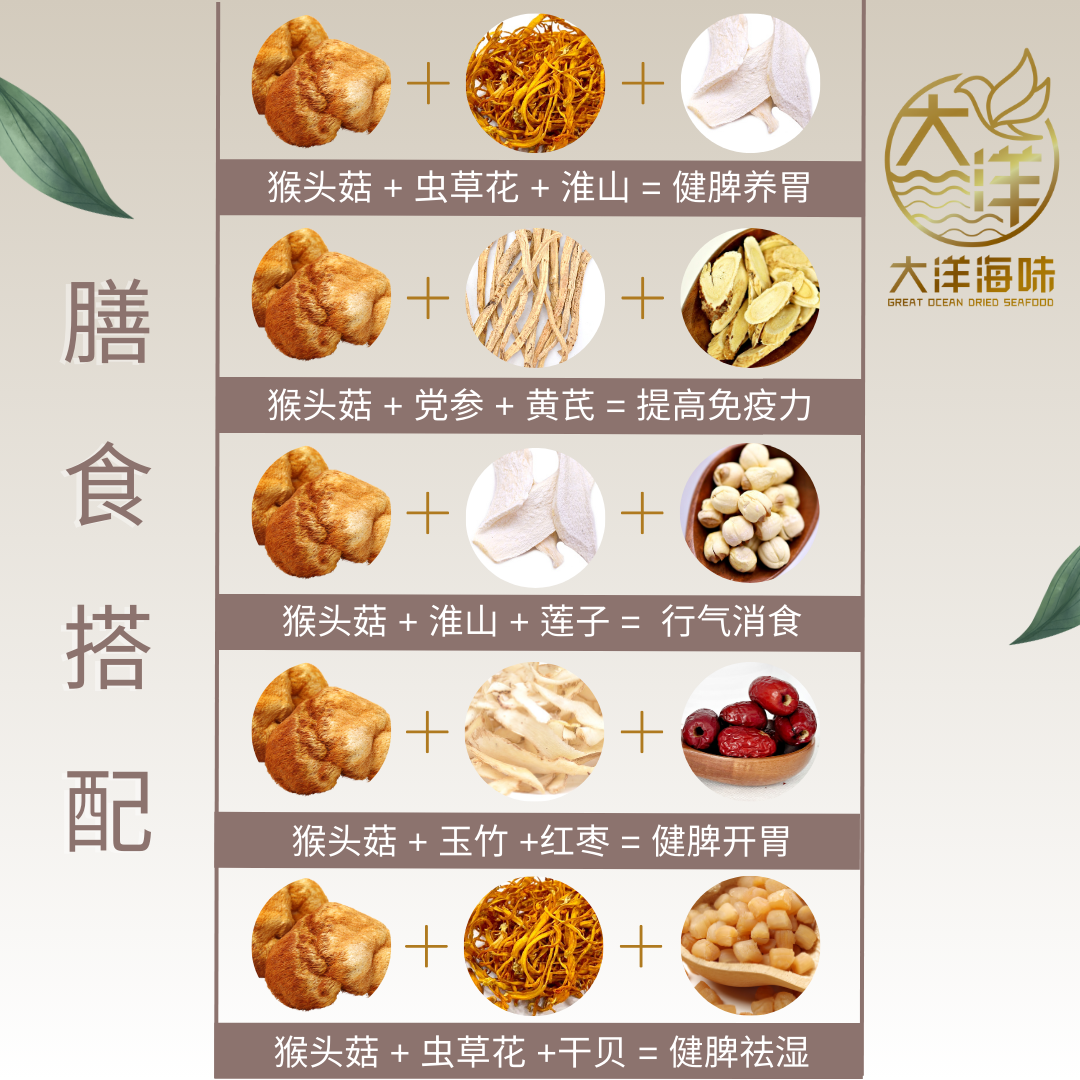 功效:猴头菇对消化不良、胃病和神经衰弱有不错的食疗功效。世人把猴头菇誉为蘑菇之王,视其为山珍。猴头菇与块菌、羊肚菌均属上乘菌类,这些菌富含蛋白质、粗纤维和碳水化合物等营养,以它们烹出浓香的汤汁,加上不同的肉类,便成为养生滋味的菜肴