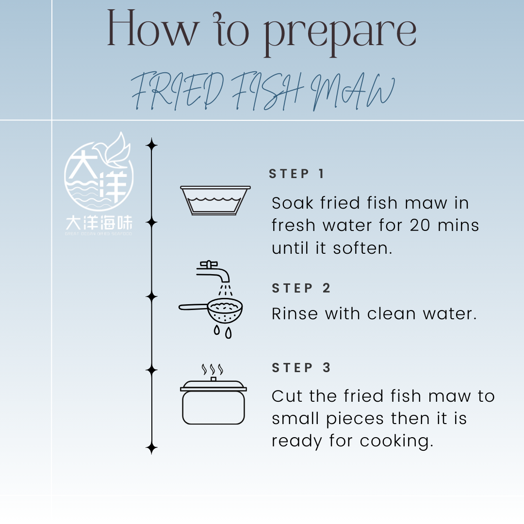How to prepare fish maw before cooking? Fish maw require pre-soaking before cooking. The soaking time will vary depending on the type of fish maw.