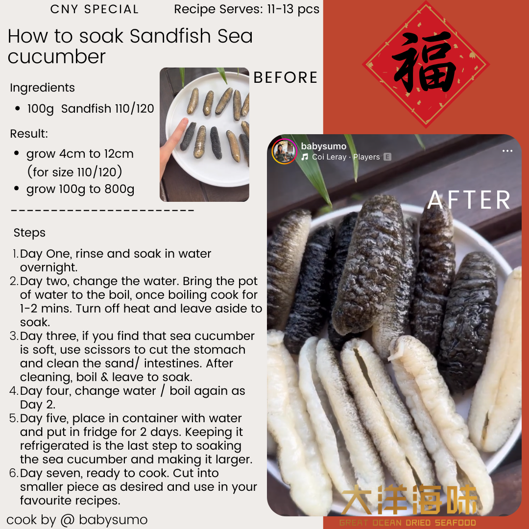 Picture of size is only for illustration, kindly note that sea cucumber are natural marine product, for more accurate for the size of sea cucumber, depend on the head and quantity of sea cucumber per kg.