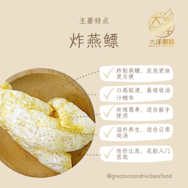 Fish maw contains rich proteins and nutrients such as phosphor and calcium.