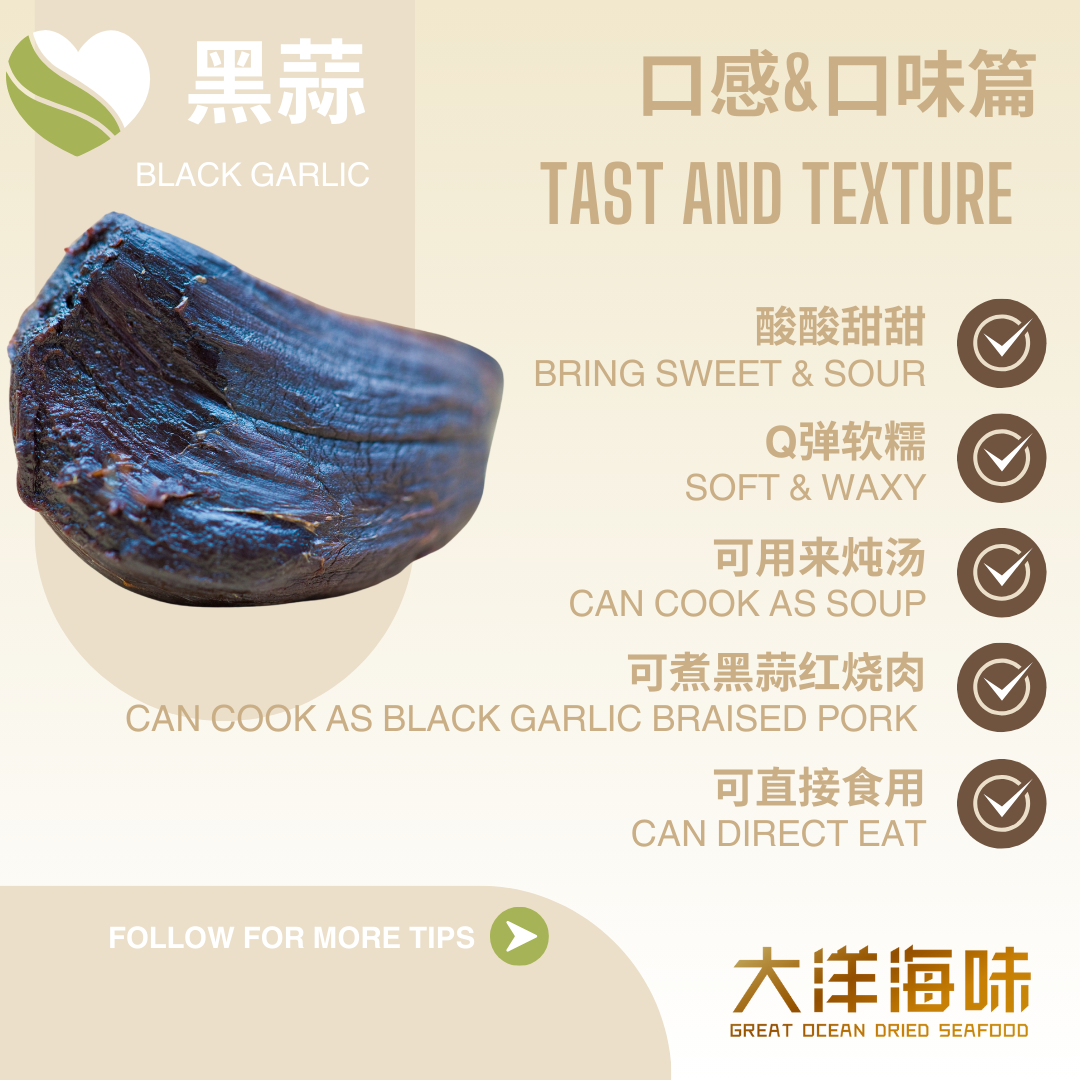 黑蒜没有大蒜所特有的味道,而是散发著可以勾起食欲的浓郁香味。为了让蒜粒保持很多的水分,全部製作过程中保持著潮湿的状态,它的外观近似果脯。这是因为经长时间的发酵和熟成使大蒜中所含的蛋白质被分解为氨基酸,碳水化合物被分解为果糖,并完整保留大蒜所含的蒜氨酸。