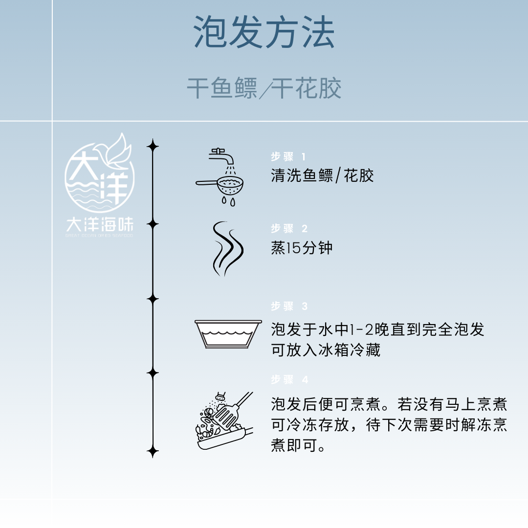 2. 若浸发后没有马上烹煮需冷冻保存。