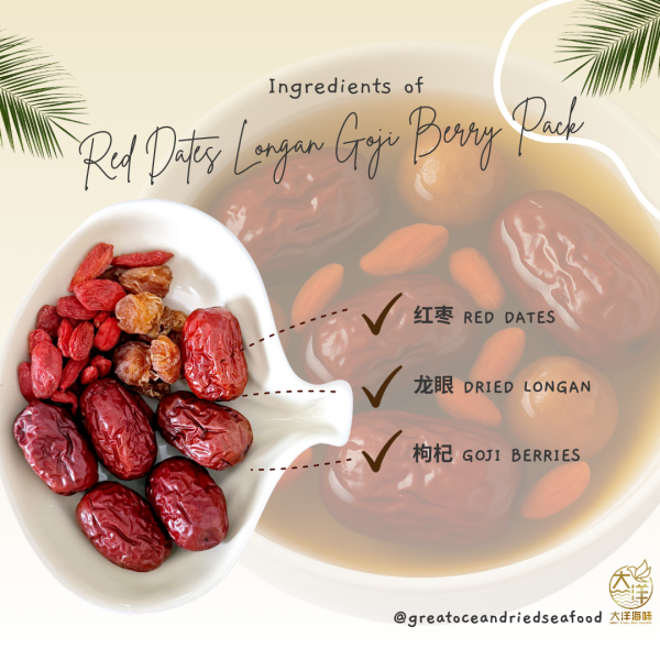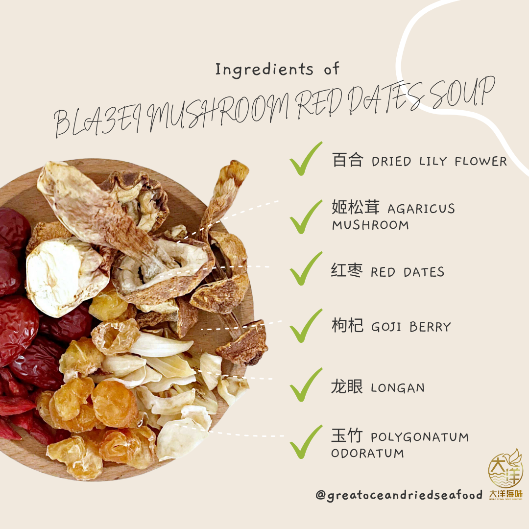 Blazei Mushroom, Lily Flower, Longan Meat, Red Dates, polygonatum odoratum, Goji Berry.